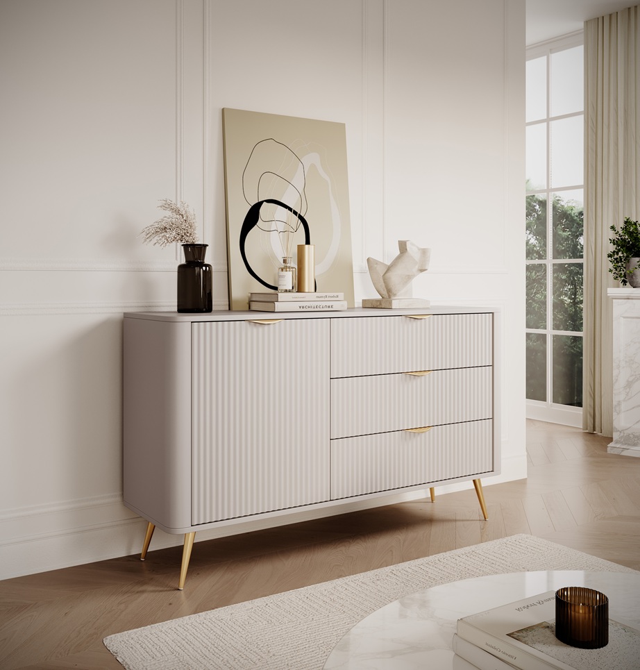 Comodă cu ușă și 3 sertare Lante, bej/auriu (138 cm)