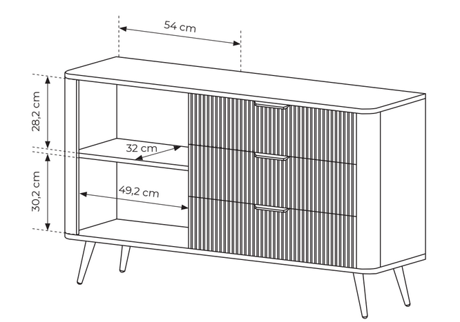 Modelul a fost gândit ca o soluție practică de depozitare, oferind organizare și expunere facilă pentru decorațiuni și obiecte personale prin rafturile deschise asimetrice și prin cele două sertare ușor accesibile.
