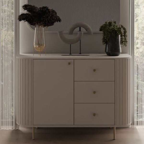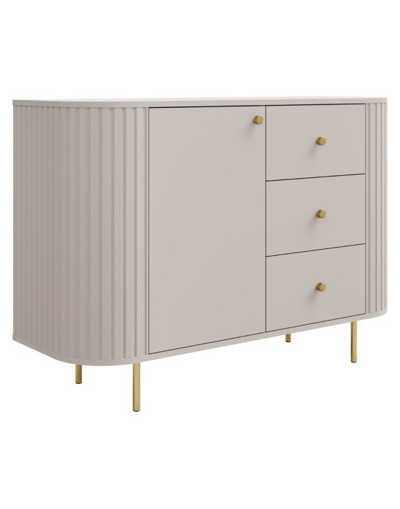 Datorită paletei sale rafinate de culori, respectiv bej nisipiu și auriu, comoda se integrează perfect în interioare primitoare și în tendințe, în diverse stiluri.
