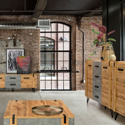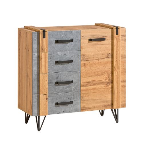 Comoda cu ușă și 4 sertare Lofter Lo6, în culorile stejar wotan și beton millenium, de la Dolmar, are o estetică industrială rafinată, care va redefini oricare amenajare interioară contemporană.