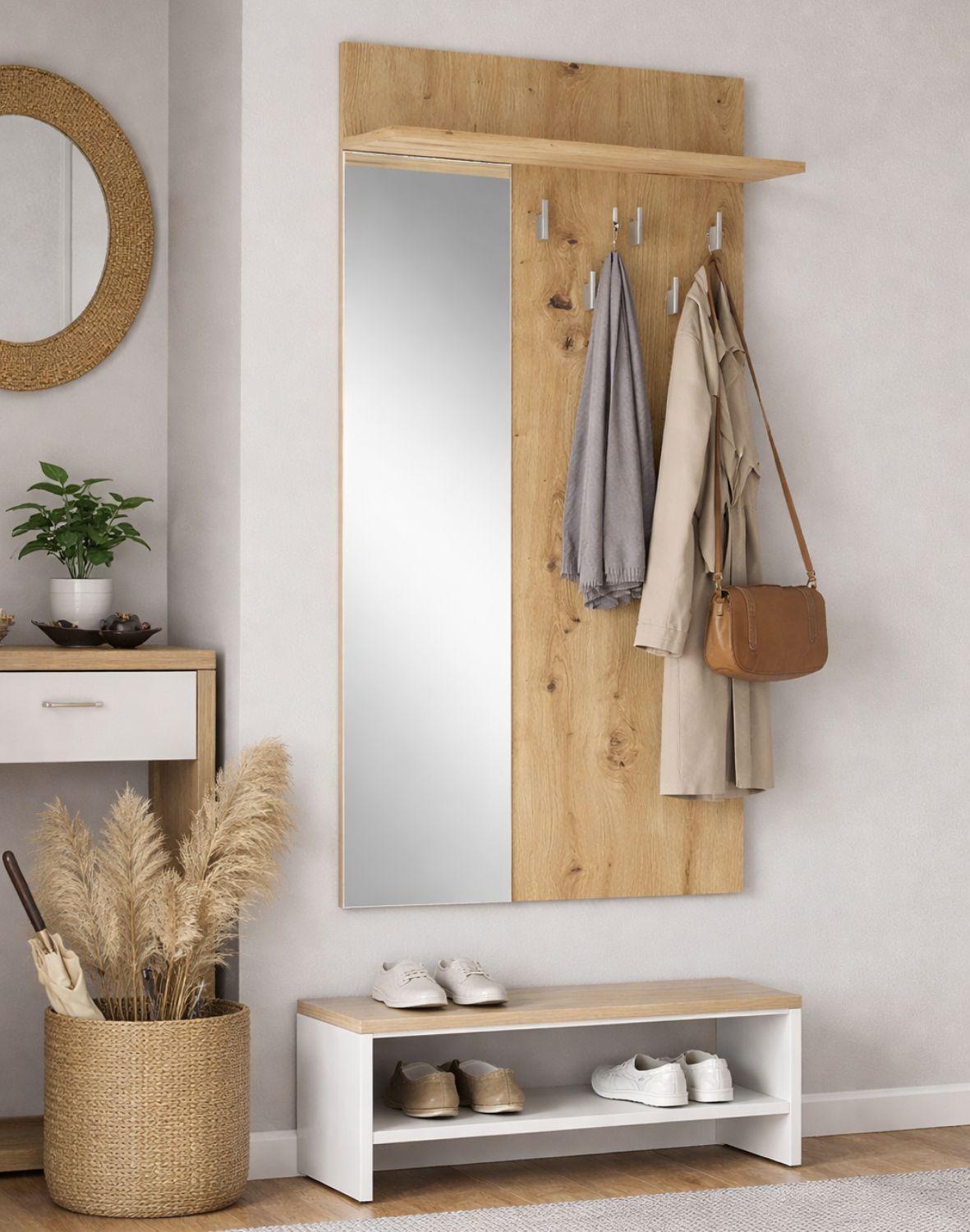 Cuierul de perete cu oglindă Lima, în culoarea stejar artizanal, de la Halmar, este o soluție de depozitare atemporală, ideală pentru a aduce un plus de ordine și stil zonei de acces.