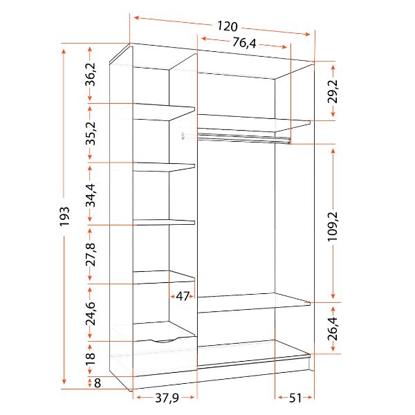 Dotat cu trei compartimente încăpătoare care ascund rafturi interioare și o bară pentru umerașe, precum și cu două rafturi deschise și un sertar, acesta permite depozitarea articolelor de îmbrăcăminte și expunerea accesoriilor.