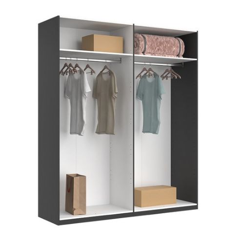 Ușile ascund două spații ample de depozitare cu bare pentru umerașe și rafturi utile pentru haine, așternuturi sau cutii organizatoare.