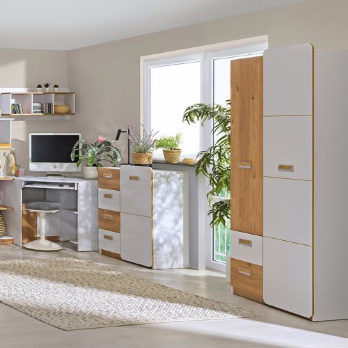 Dulapul Lorento L1, în culorile alb și stejar nash, de la Dolmar, combină estetica nordică cu funcționalitatea sporită, perfecte pentru camera unui copil sau adolescent, sau chiar pentru un dormitor liniștit.
