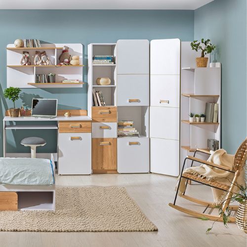 Dulapul de colț Lorento L14, în culorile alb și stejar nash, de la Dolmar, combină estetica nordică cu funcționalitatea sporită, perfectă pentru camera unui copil sau adolescent, sau chiar pentru un dormitor liniștit.