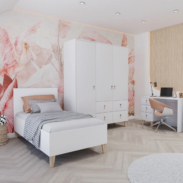 Dulapul Figo 3D4S de la Idźczak este o soluție de depozitare practică și elegantă pentru camerele copiilor sau ale adolescenților, precum și pentru dormitorul oaspeților sau al adulților.