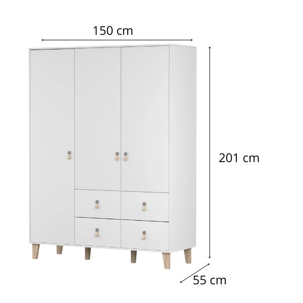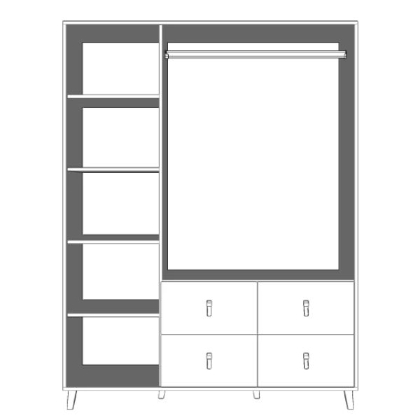 Acest model dispune de patru sertare spațioase și de trei uși în spatele cărora se află rafturi funcționale și o bară pentru umerașe.