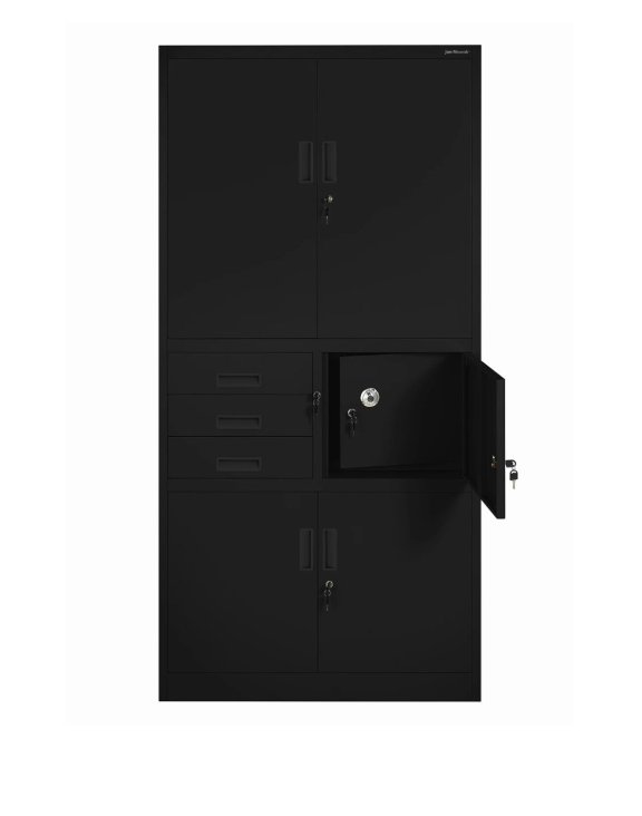 Dulapul metalic Filip II, în culoarea negru, este o piesă de mobilier versatilă ce aduce ca inovație seiful, securizat cu cifru, în care poți depozita obiecte de valoare.