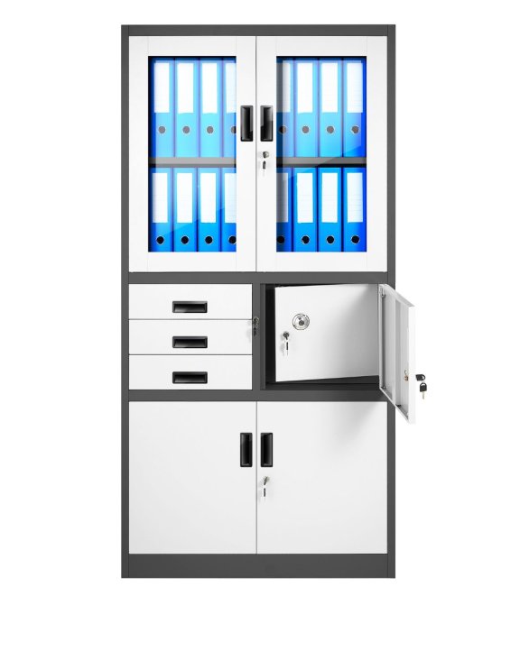 Dulapul metalic Filip cu seif, în culorile antracit și alb, este excelent pentru cabinete medicale, clinici, ateliere, birouri, universități, școli sau alte instituții.