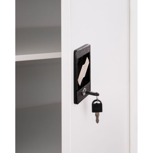 Ușa robustă este echipată cu o încuietoare cu came și cheie care asigură securitatea conținutului dulapului, garantându-ți confidențialitate și protecția datelor.