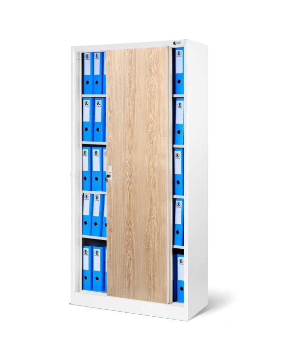Dulapul metalic Kuba cu uși glisante, în culorile alb și stejar sonoma, de la Jan Nowak este excelent pentru birouri, clinici, cabinete medicale, ateliere, universități, școli sau alte instituții.
