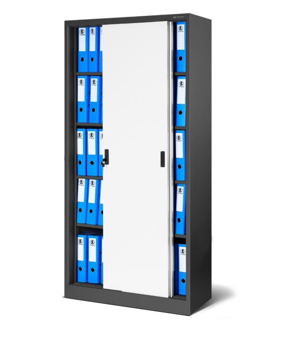 Dulapul Kuba cu uși glisante, în culorile antracit și alb, de la Jan Nowak este excelent pentru birouri, cabinete medicale saude avocatură, universități, școli sau alte instituții.