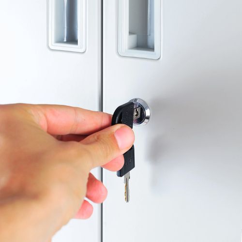 Ușile dulapului sunt echipate cu o încuietoare solidă cu cheie, care garantează securitatea documentelor și obiectelor depozitate. Această caracteristică este esențială pentru respectarea reglementărilor privind protecția datelor (GDPR).