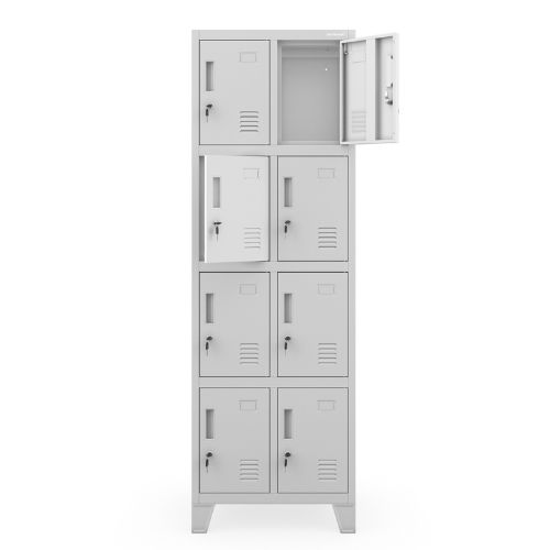 Fiecare compartiment este securizat printr-o ușă solidă echipată cu o încuietoare individuală cu cheie. Acest sistem garantează siguranța obiectelor stocate, de la îmbrăcăminte și încălțăminte până la genți, documente de identitate sau alte bunuri valoroase.