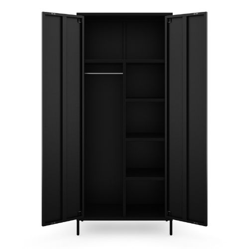 Piesa de mobilier în culoarea uni neagră, cu două uși, se potrivește cu diferite stiluri de amenajări interioare, precum cel minimalist sau cel industrial.