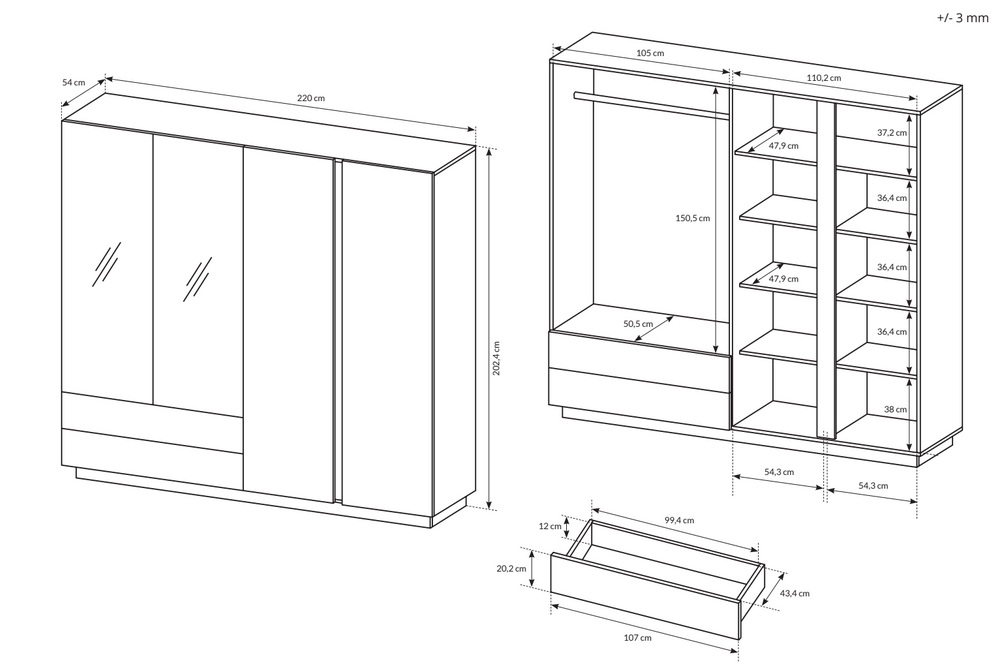 În spatele ușilor cu balamale se ascunde un spațiu amplu de depozitare, oferind numeroase rafturi interioare și o bară pentru umerașe, ca să-ți poți organiza hainele într-un mod îngrijit și ordonat.