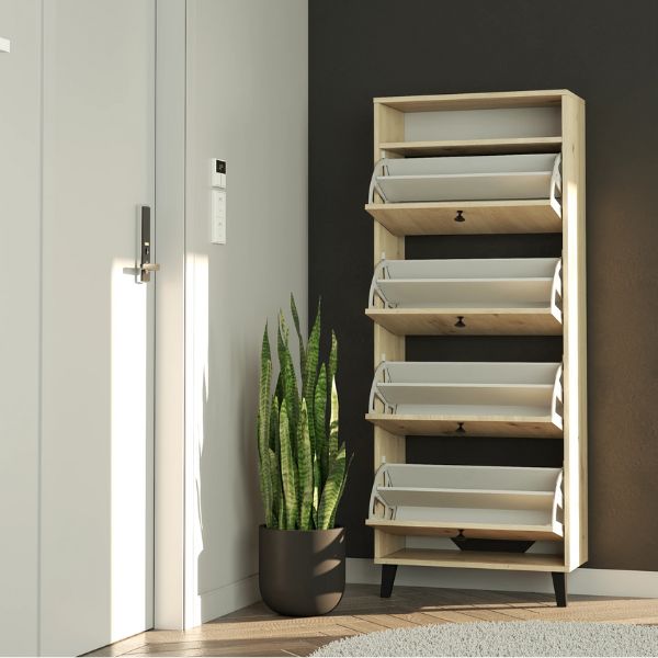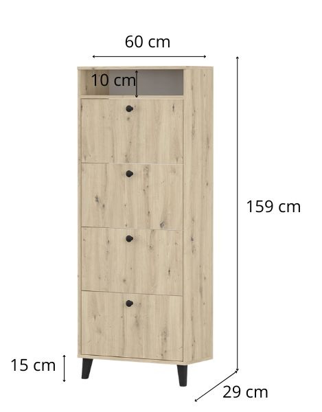 Dulapul de pantofi Hermes 4A de la Idźczak este conceput pentru spațiile de dimensiuni reduse, precum holuri, dressinguri sau balcoane, ajutând la păstrarea încălțămintei în ordine.