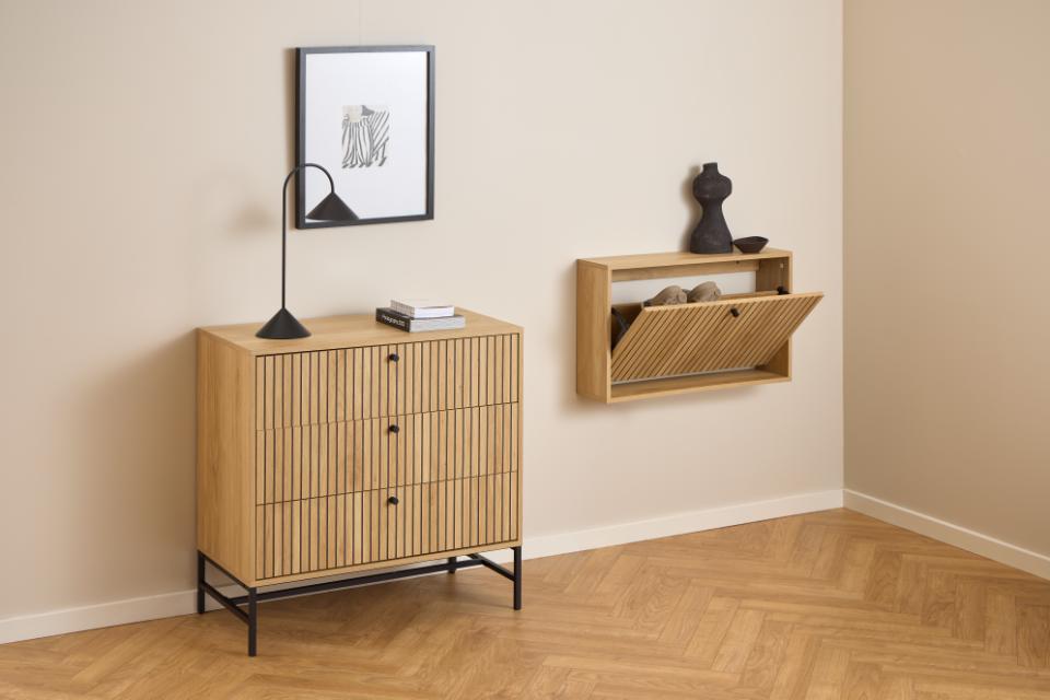 Dulapul de pantofi suspendat Albany, în culoarea stejar natural, de la Actona, este o soluție elegantă și practică de depozitare pentru holul de la intrare, ajutând la păstrarea ordinii și la crearea unui aer modern în interior.
