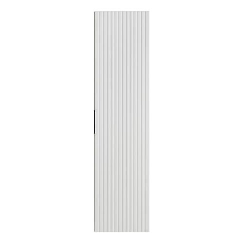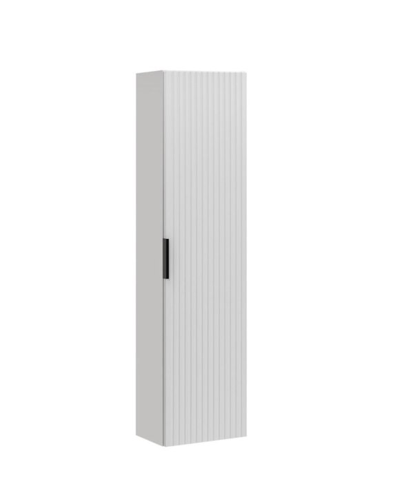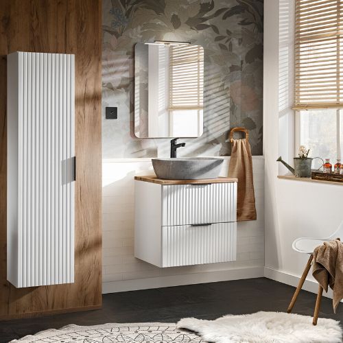 Dulapul suspendat pentru baie Adel de la Comad creează un efect vizual unic în baie, cu o combinație distinctivă între nuanța imaculată de alb și riflajele verticale ale fațadelor.