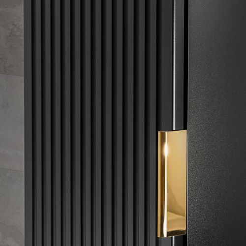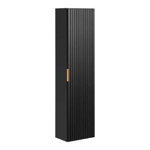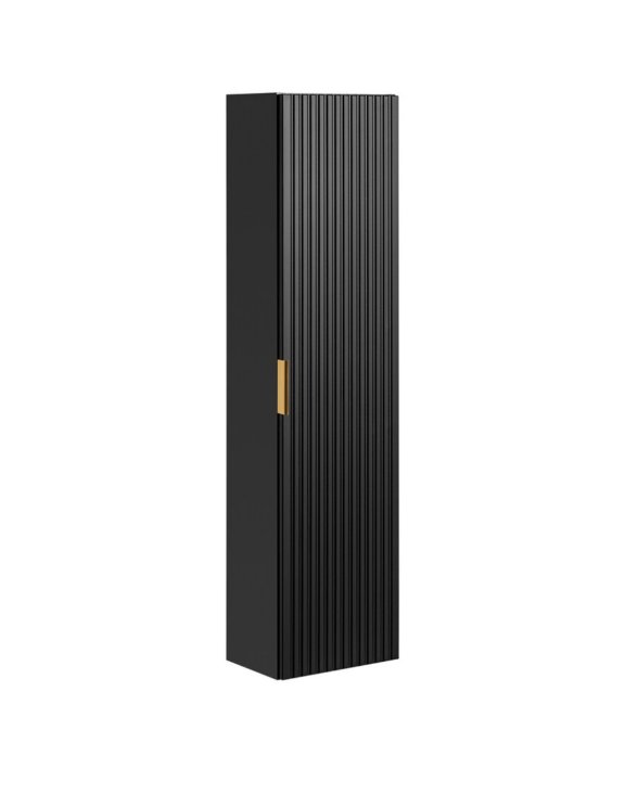 Dulapul suspendat pentru baie Adel de la Comad creează un efect vizual unic în baie, cu o combinație modernă între nuanța profundă de negru și cea prețioasă de auriu, precum și cu riflajele verticale ale fațadelor.