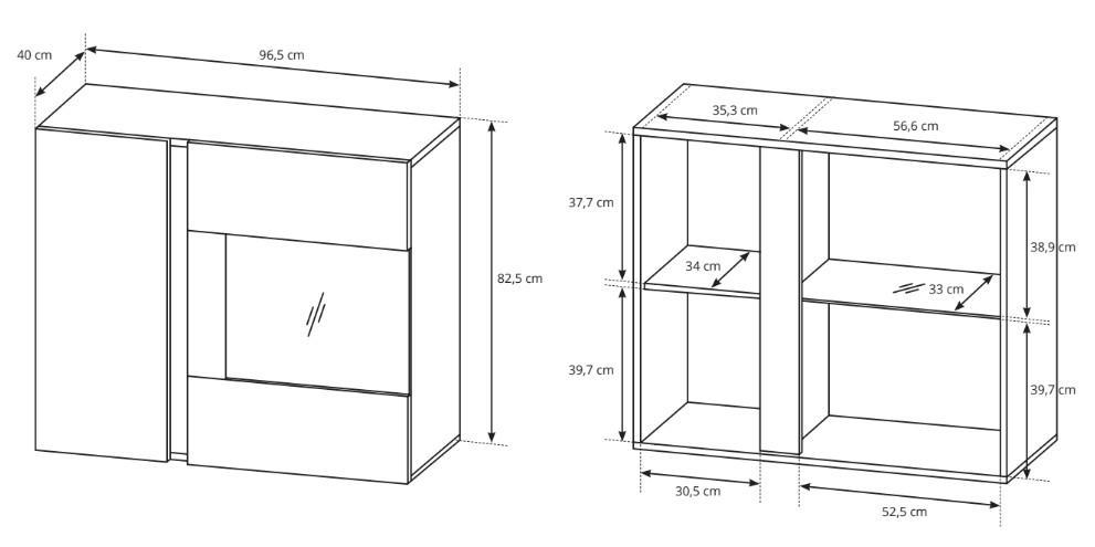 În spatele ușilor cu oglindă se află o bară pentru umerașe, astfel încât să îți poți agăța hainele în mod ordonat și îngrijit. Sub acestea sunt două sertare încăpătoare pentru accesorii sau așternuturi. Cealaltă secțiune este formată din două uși cu balamale și 10 rafturi interioare pentru organizarea inteligentă a obiectelor stocate.