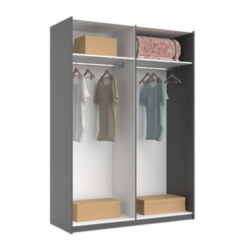 Ușile glisante ascund două spații ample de depozitare cu bare pentru umerașe și rafturi utile pentru haine, așternuturi sau cutii organizatoare.