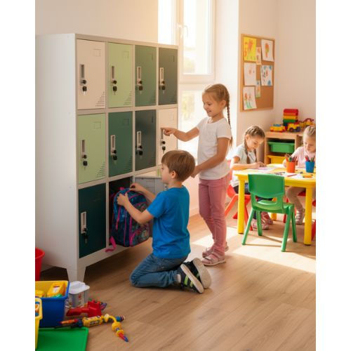 Dulapul de vestiar pentru copii Rio Green de la Storfy este special conceput pentru spații în care funcționalitatea întâlnește estetica prietenoasă, fiind ideal pentru creșe, grădinițe, școli primare, dar și centre de zi sau programe after-school.