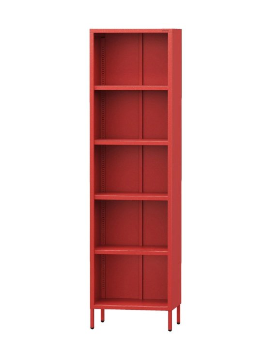 Etajera înaltă Modern MARIO de la Jan Nowak, în culoarea uni roșie, este o piesă de mobilier compactă, dar extrem de încăpătoare, ideală pentru depozitarea obiectelor de diferite dimensiuni.