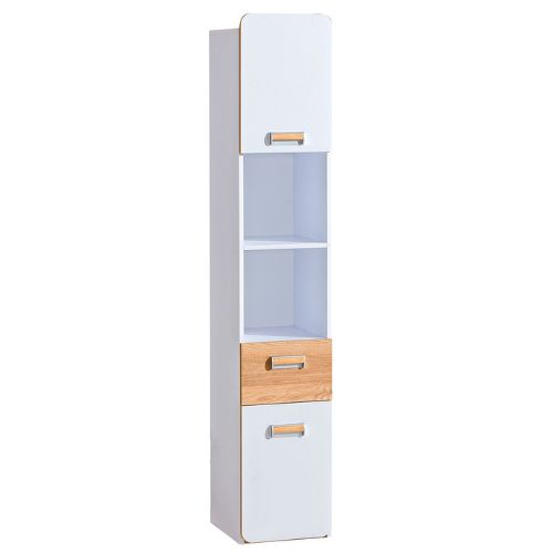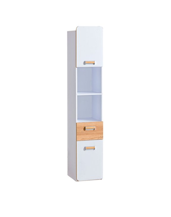 Etajeră îngustă Lorento L3, în culorile alb și stejar nash, de la Dolmar, combină estetica nordică cu funcționalitatea sporită, perfecte pentru camera unui copil sau adolescent, sau chiar pentru un dormitor liniștit.