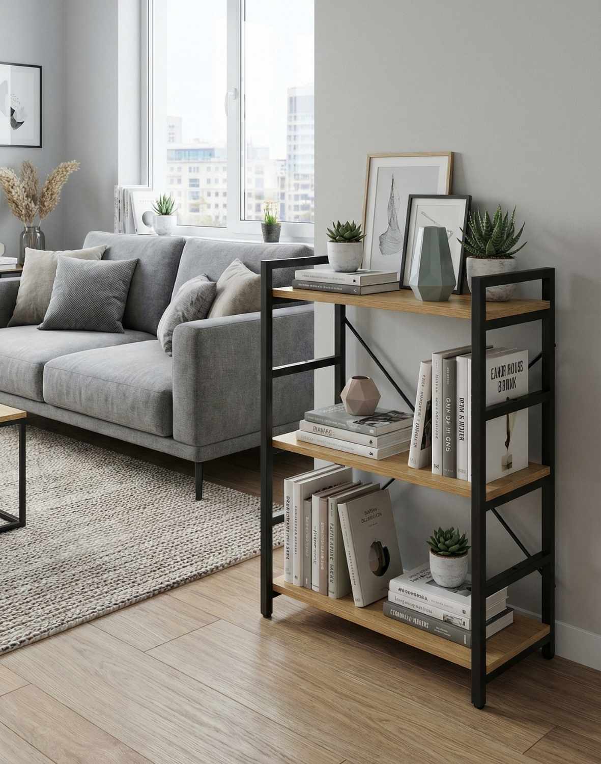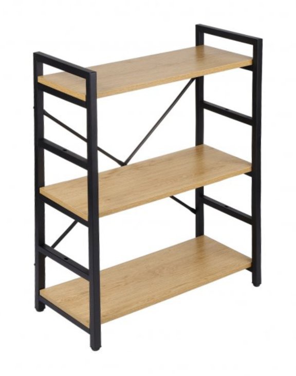 Nuanța de stejar a rafturilor se potrivește foarte bine cu culoarea neagră a structurii metalice.