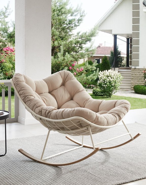 Fotoliul-balansoar de grădină Havana, în culoarea bej, de la Avida Design, este o combinație unică de stil modern, confort și funcționalitate.