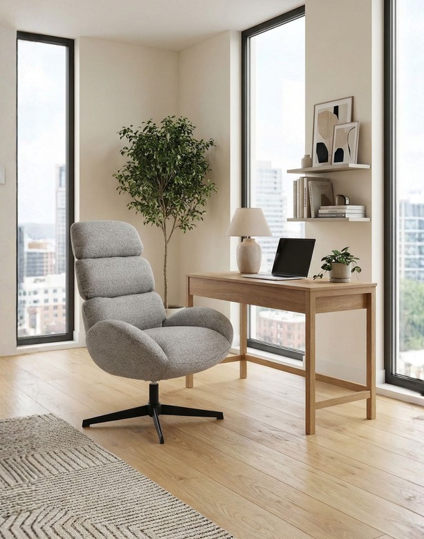 Fotoliul pivotant Cloud gri de la Avida Design combină confortul, designul modern și funcționalitatea.