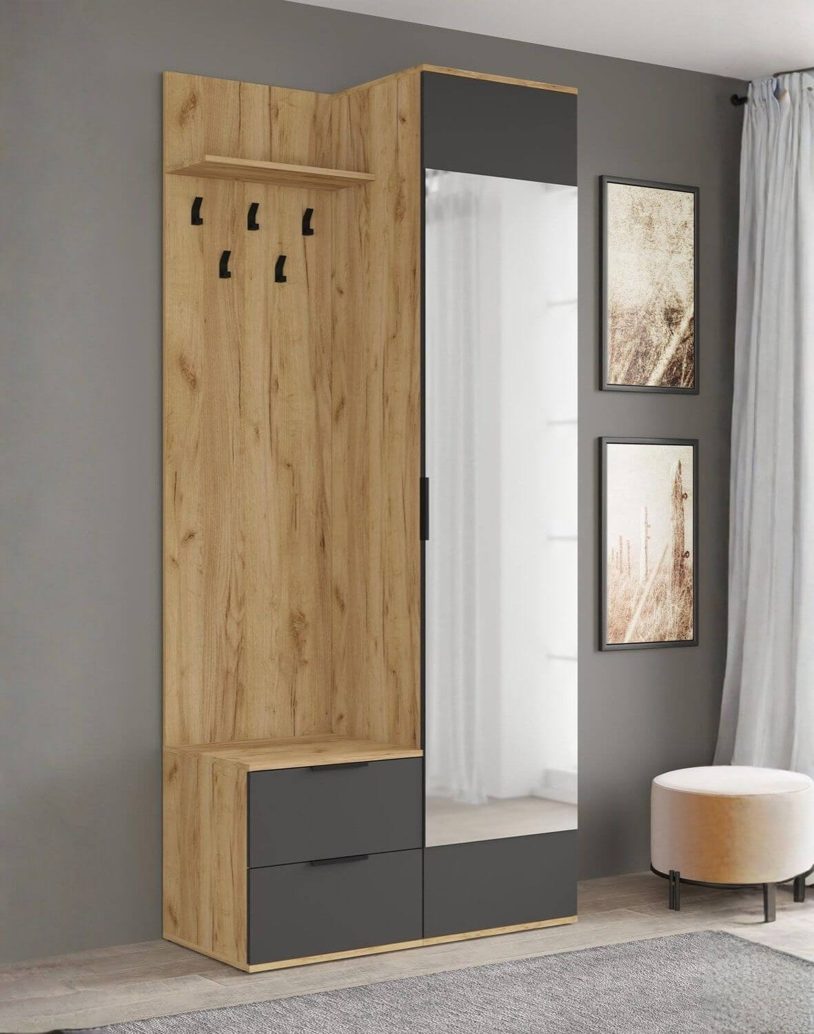 Realizată din PAL ce redă cu fidelitate textura naturală de lemn, aceasta integrează o oglindă generoasă care reflectă lumina, transformând intrarea într-un spațiu primitor, aerisit și impecabil organizat pentru hainele și accesoriile tale esențiale.