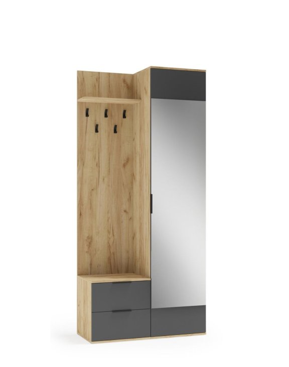 Garderoba pentru hol Coral, în culorile stejar auriu/antracit, de la Halmar, este un set de mobilier funcțional care combină estetica și utilitatea într-o formă compactă.