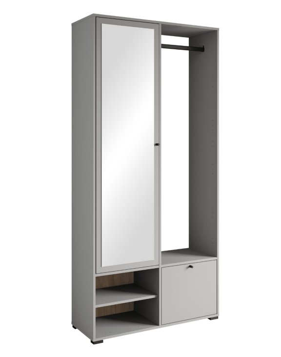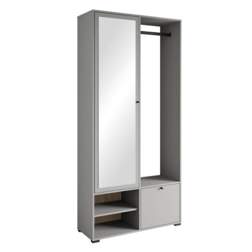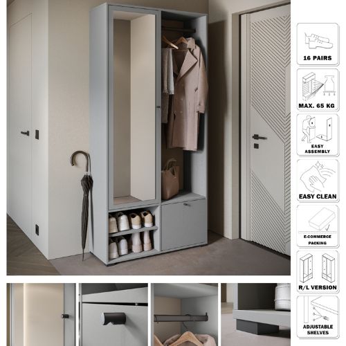 Garderoba de hol Dino gri paladiu de la Bratex este o piesă de mobilier elegantă, modernă și extrem de funcțională, ideală pentru hol, studio sau hotel.