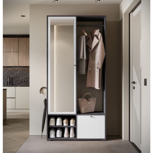 Partea frontală este prevăzută cu o oglindă verticală mare, care are o funcție practică, dar și estetică. Aceasta îți permite să-ți verifici rapid aspectul înainte de a ieși din casă, mărind în același timp vizual încăperea.