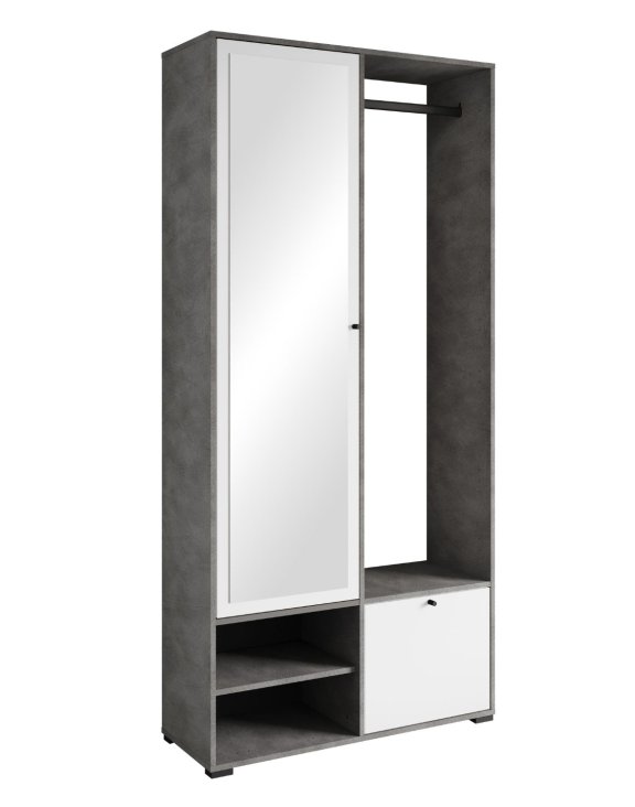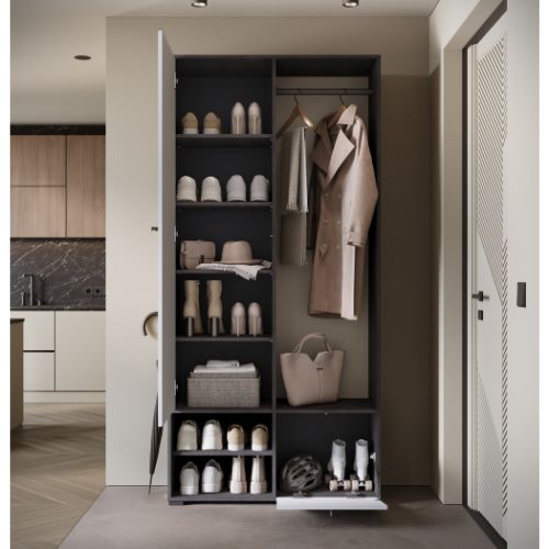 În partea stângă, există un compartiment cu ușă și rafturi interioare practice, care permit depozitarea organizată a diverselor accesorii, precum pălăriile sau fularele. Rafturile sunt dispuse astfel încât să poată acomoda articole de diferite dimensiuni.