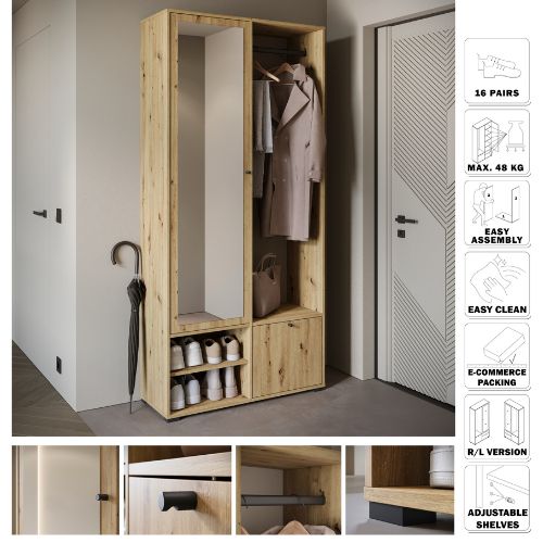 În partea stângă, există un compartiment cu ușă și rafturi interioare practice, care permit depozitarea organizată a diverselor accesorii, precum pălăriile sau fularele. Rafturile sunt dispuse astfel încât să poată acomoda articole de diferite dimensiuni.