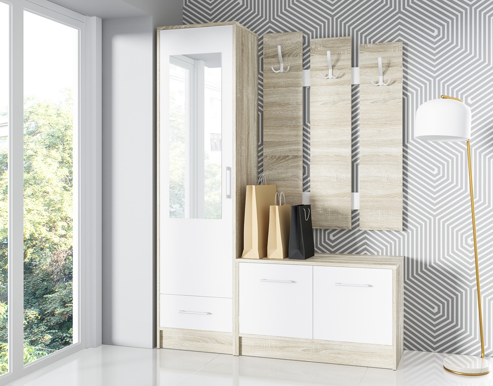 Garderoba pentru hol cu oglindă Maxi, în culorile stejar sonoma și alb, de la PK Mebel, optimizează complet orice hol contemporan cu estetica sa modernă, care se remarcă printr-o funcționalitate sporită.