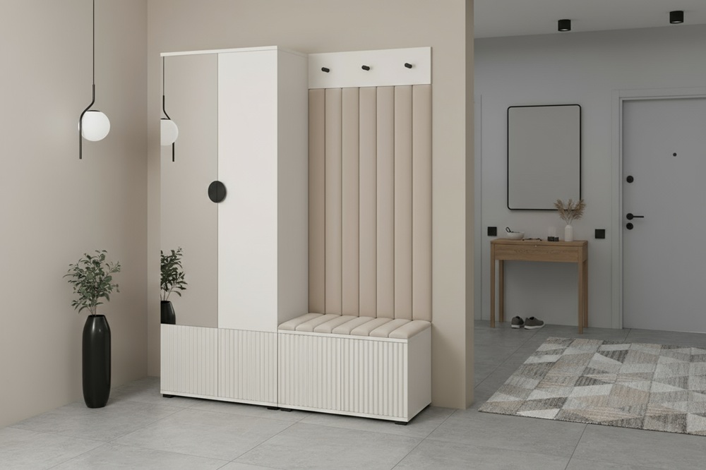 Garderoba pentru hol cu oglindă Rayo, în bej și cașmir, de la PK Mebel, combină glamourul modern cu funcționalitatea sporită, integrându-se perfect în interioare scandinave, eclectice, maximaliste etc.
