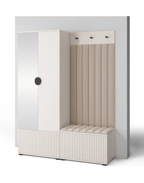 Configurația sa este una foarte ingenioasă, incluzând un dulap cu oglindă și bară pentru umerașe, un pantofar multifuncțional care servește și ca bancă și un cuier cu trei cârlige metalice, pentru un hol organizat.