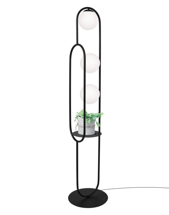 Lampa de podea Finestra se distinge prin cadrul său suplu din metal negru, pe care sunt amplasate cele trei abajururi sferice din sticlă albă lăptoasă.