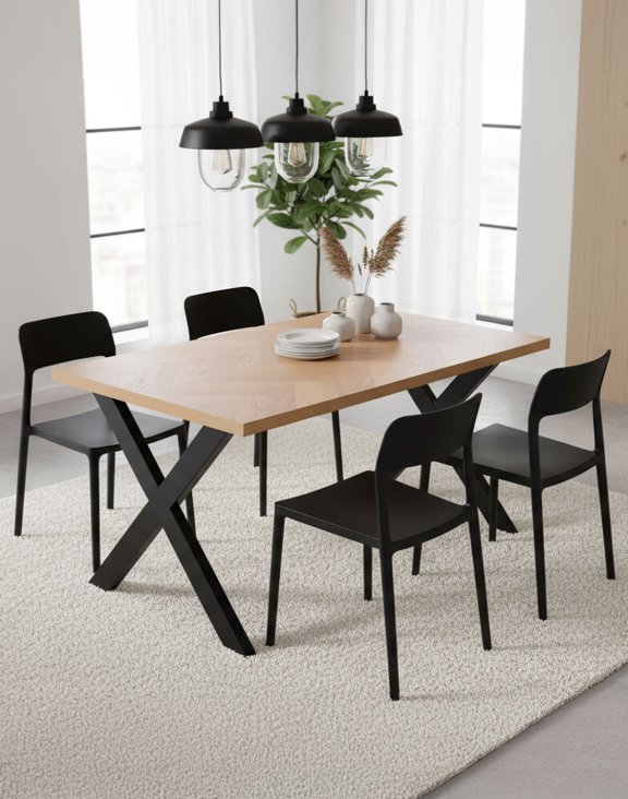 Structura este montată pe picioare solide, în formă de cruce, din metal negru mat. Construcția lor stabilă nu numai că îi garantează mesei durabilitate și siguranță, dar îi și conferă un aspect industrial.