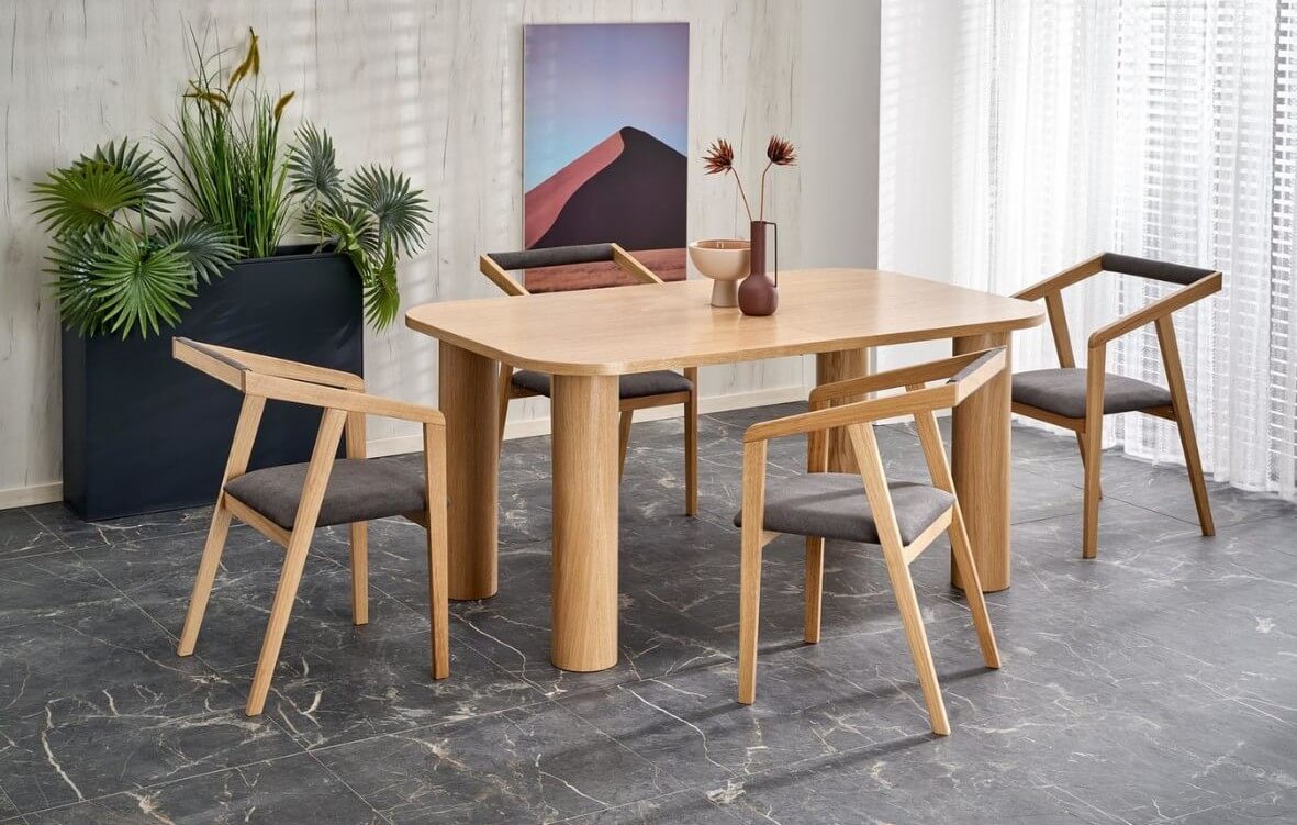 Masa extensibilă Elefante (160-240x100 cm), în culoarea stejar natural, de la Halmar, este o piesă statement care îmbină perfect designul modern cu durabilitatea și confortul, ideală pentru interioarele sofisticate.