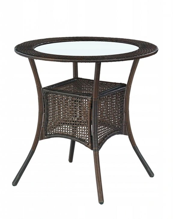 Blatul rotund, cu un diametru de 74 cm, este realizat din sticlă, iar linia perimetrală a acestuia este realizată din ratan sintetic (tehnoratan) în culoarea maro închis.