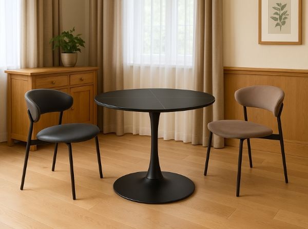 Forma rotundă a blatului favorizează conversațiile și creează o atmosferă intimă și primitoare.
