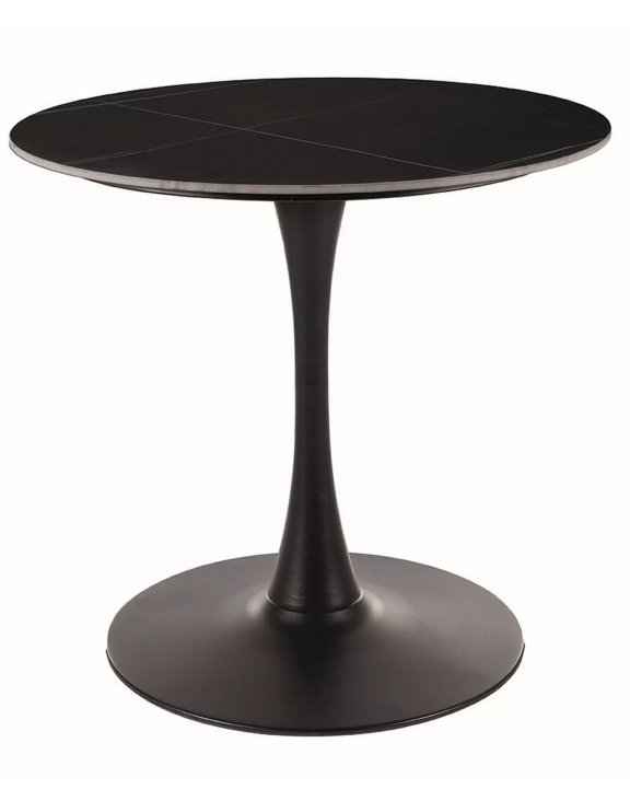 Blatul rotund cu diametrul de 80 cm este realizat din ceramică neagră cu aspect marmorat, ceea ce îi conferă un aer luxuriant și face ca suprafața sa să fie ușor de curățat și rezistentă la utilizarea zilnică.