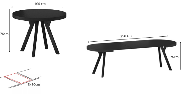 Blatul rotund are un diametru de 100 cm în forma restrânsă. Acesta poate fi extins până la 250 cm lungime datorită celor trei inserții suplimentare de câte 50 cm fiecare.