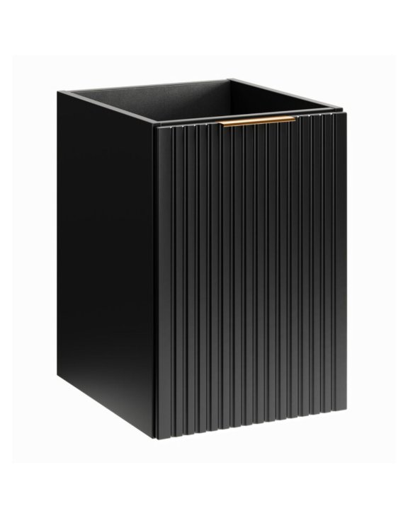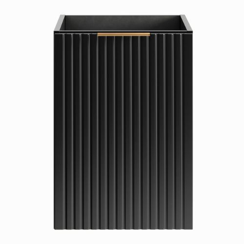 Masca suspendată pentru chiuveta de la baie Adel de la Comad creează un efect vizual unic în baie, cu o combinație modernă între nuanța profundă de negru și cea prețioasă de auriu, precum și cu riflajele verticale ale fațadelor.