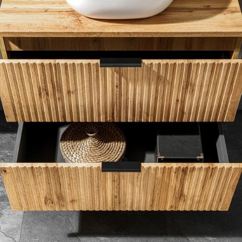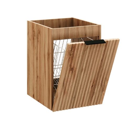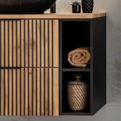 Masca suspendată cu blat și coș de rufe pentru chiuveta de la baie Adel de la Comad creează un efect vizual unic în baie, cu o combinație modernă între nuanța naturală stejar wotan și cea elegantă, mată, de negru, precum și cu riflajele verticale ale fațadelor.